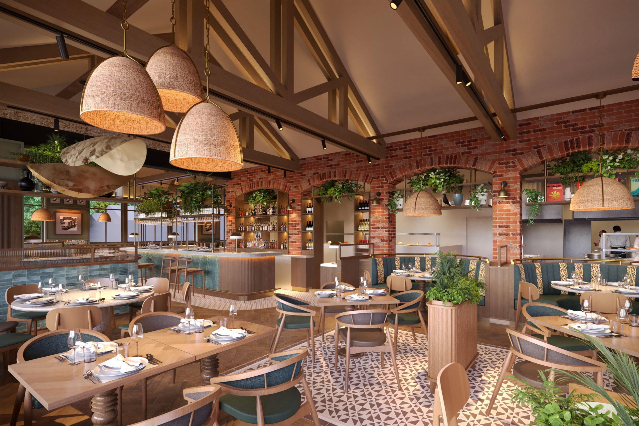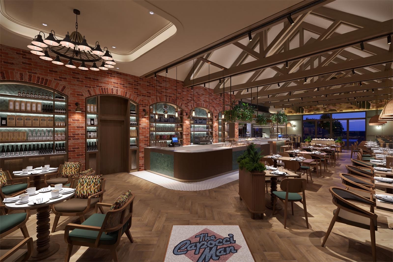 The new venue will include a restaurant and bar area, supported by a fully equipped kitchen and dedicated food preparation areas. The interiors will combine exposed brickwork and timber ceiling beams, terrazzo-style counters, and warm wood furnishings.
