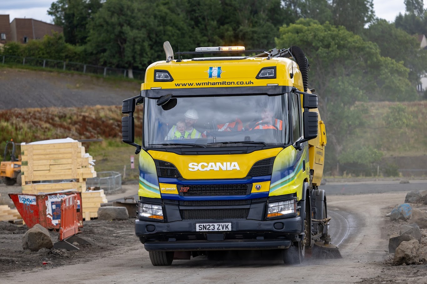 A William Hamilton lorry arrived outside Harris’ house with the lights flashing and horn tooting. Harris was then presented with his own-sized PPE kit before being invited, along with his dad, into the cab for a site tour. He was then escorted to Advance Construction’s digger, where he sat in the driving seat before being presented with his own keepsake digger.